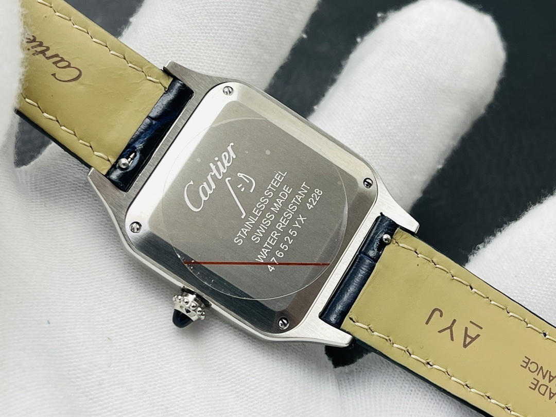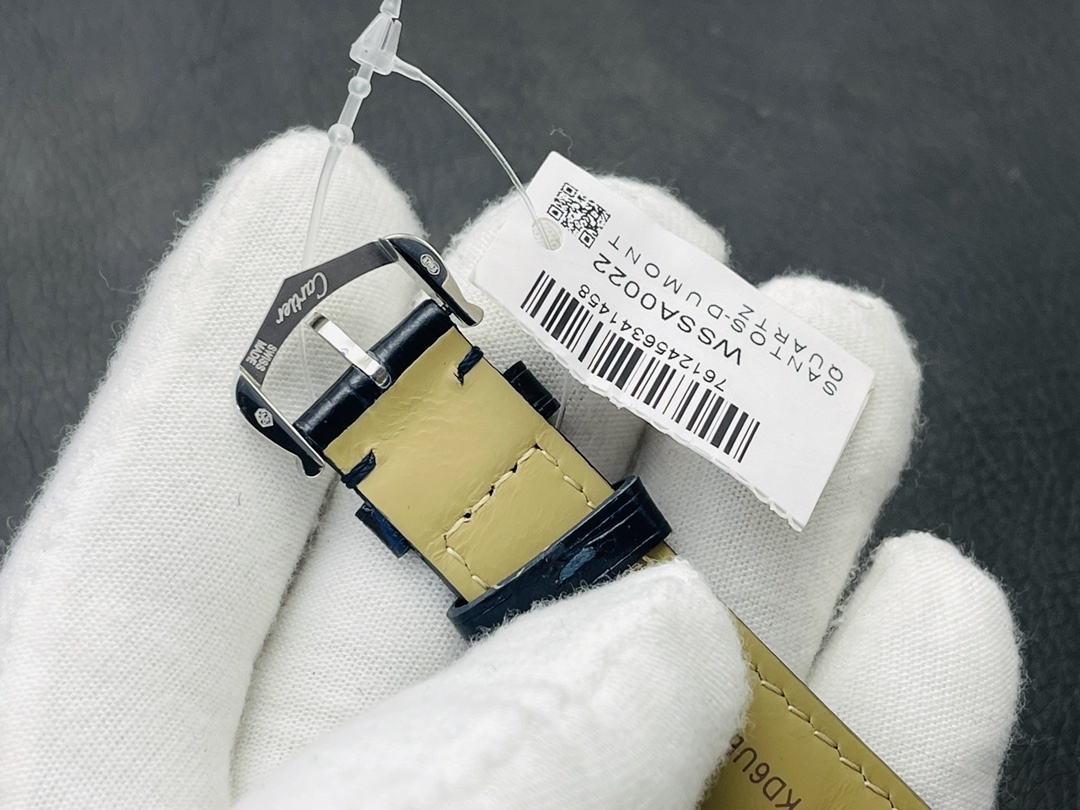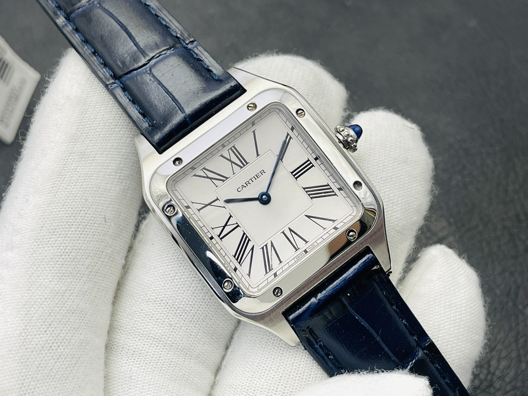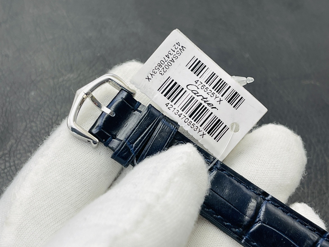 Cartier卡地亚Santos-Dumont石英机械腕表 精钢手表 指针:剑形蓝钢 镜面:蓝宝石水晶镜面 表带:海军蓝色鳄鱼皮 表壳:精钢 表扣:精钢针扣式 防水深度:30米生活防水 表盘:镀银磨砂表盘,阳光射线纹饰效果 表冠:圆珠形表冠,镶嵌1颗凸圆形合成尖晶石 型号:WSSA0086 机芯:高效率石英机芯 表盘长度:38mm表 盘宽度:27.5mm 表盘厚度:7.3mm